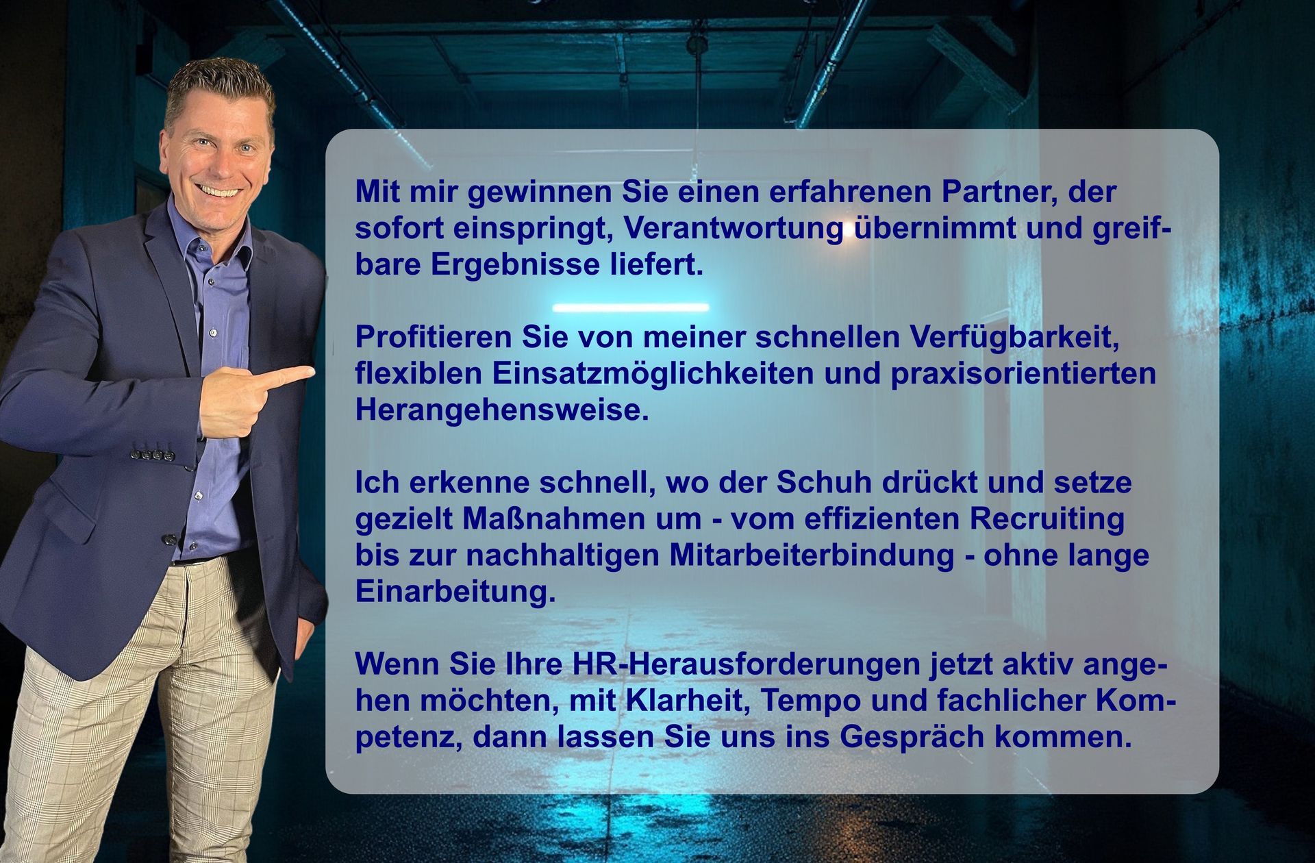 Als erfahrener HR-Experte mit langjähriger Erfahrung und umfangreichem Netzwerk übernehme ich kurzfristig und interimistisch